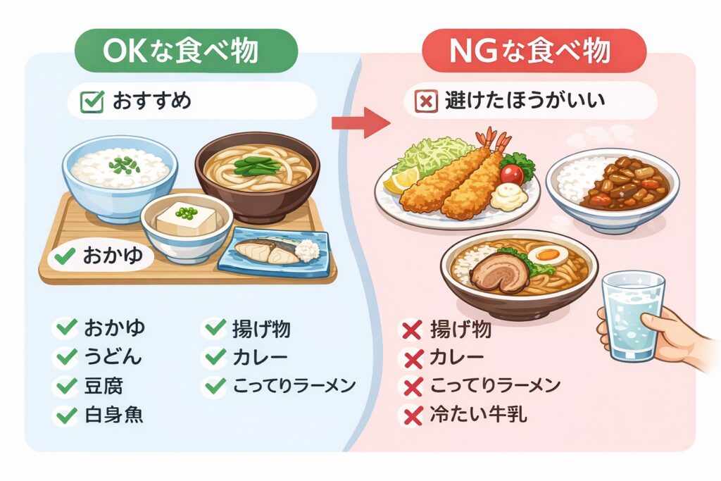 • 乳製品:一時的な乳糖不耐状態になることがあるため、回復後も少量から試しましょう。